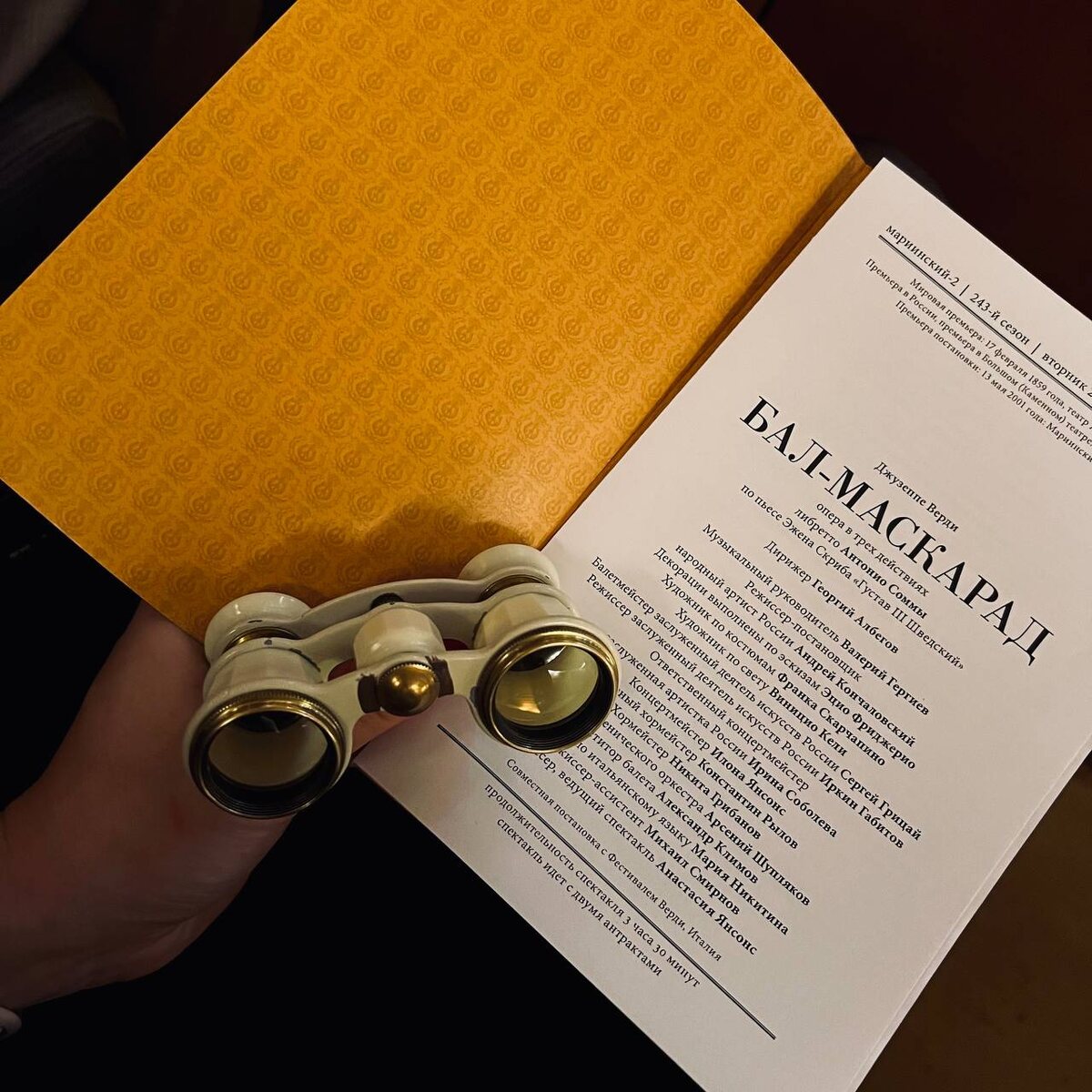 Вечер был хмурым, дождливым. Но для меня он наполнился множеством красок, потому что я отлично провела его в Мариинском театре. Оперу Джузеппе Верди «Бал-маскарад» давали на новой сцене (в Мариинском-2), где для комфорта зрителей созданы, на мой взгляд, идеальные условия. Здесь просторный гардероб, много туалетов на каждом ярусе, лифты, эскалаторы. Стильное «янтарное» фойе словно приглашает зрителей сфотографироваться на память. В буфете с панорамными окнами на Крюков канал перед началом спектакля можно забронировать столик и сделать заказ, чтобы не стоять в очереди в антракте. В зрительном зале чудесная акустика, к вентиляции тоже нет претензий. Практически с любого места хорошо видна вся сцена. Но у каждого, наверное, есть свои предпочтения, я люблю ложи бенуара, откуда вот такой обзор сцены. Оперу «Бал-маскарад» профессиональные критики относят к вершинам творчества Верди. Но на сцене Мариинки она идёт довольно редко. Почему? Я не знаю. Толчком для рождения шедевра послужило громкое