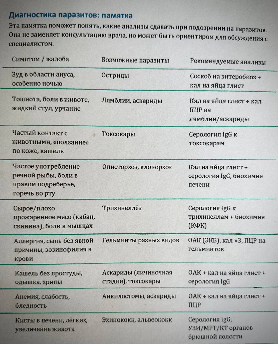 Анализы на паразитов🪱 Многие привыкли думать, что паразиты — это только глисты. Сдаёшь анализ кала на яйца глист — он, как правило, отрицательный. И всё: значит, паразитов нет. Но на самом деле глисты — это лишь малая часть «живности», которая может поселиться в организме ребёнка. И первый вопрос, который возникает у родителей: какие анализы нужно сдать, чтобы узнать, кто живёт в организме ребёнка и в каком количестве? Стоит ли бить тревогу или «само рассосётся»? Нуууу, начинаю размазывать информацию))) Существует огромнейший список симптомов, что у ребенка паразитарная загрузка и пора задуматься о прохождении противопаразитарного протокола. Вот только часть из этого списка: • Скрежет зубами • Поллиноз • Запоры, периодически сменяемые диареей («ни с того ни с сего») • Стимы (например, взмахи руками) • Очень сильная потливость во сне • Плохой набор веса • Ухудшение поведения, усиление симптомов в период полнолуния и др. • Вялость, слабость • Бледность и синева под глазами • Внезапное