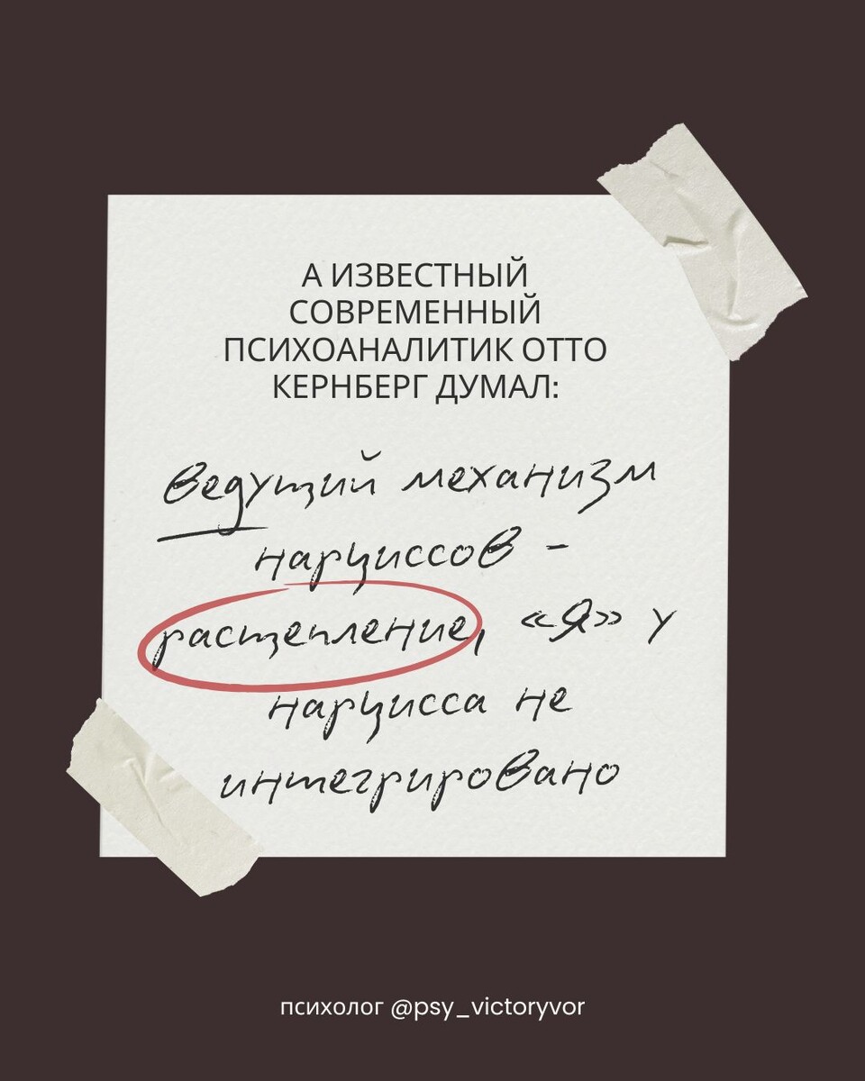 Есть 2, не менее интересная, теория о связи нарцисссизма с механизмом проживания расставания 🔥 Ведущая идея популярного, современного психоаналитика Отто Кернберга — это механизмы расщепления и ярости нарцисса Кернберг считал, что у нарцисса «Я» не интегрировано, оно собрано из кусочков — он не может удерживать в голове, что он одновременно и хороший, и плохой. Точно так же он думает и про других.Механизм расщепления: Партнёр = либо идеал (почти бог), либо ничтожество. Себя он тоже воспринимает как: «Я либо гений, либо полное ничтожество». 🧠 Это психика, которая не может удерживать противоречия — она выбирает крайности. Почему он не выносит расставаний? потому что потеря «идеального» партнёра: 😡вызывает огромную ярость («Как ты мог меня бросить?!»), или стыд и унижение («Я недостоин любви»), а чаще — всё вместе. Эта ярость может быть настолько сильной, что человек становится мстительным, жестоким, манипулятивным — просто чтобы справиться с разрушительной болью и стыдом, которую он н