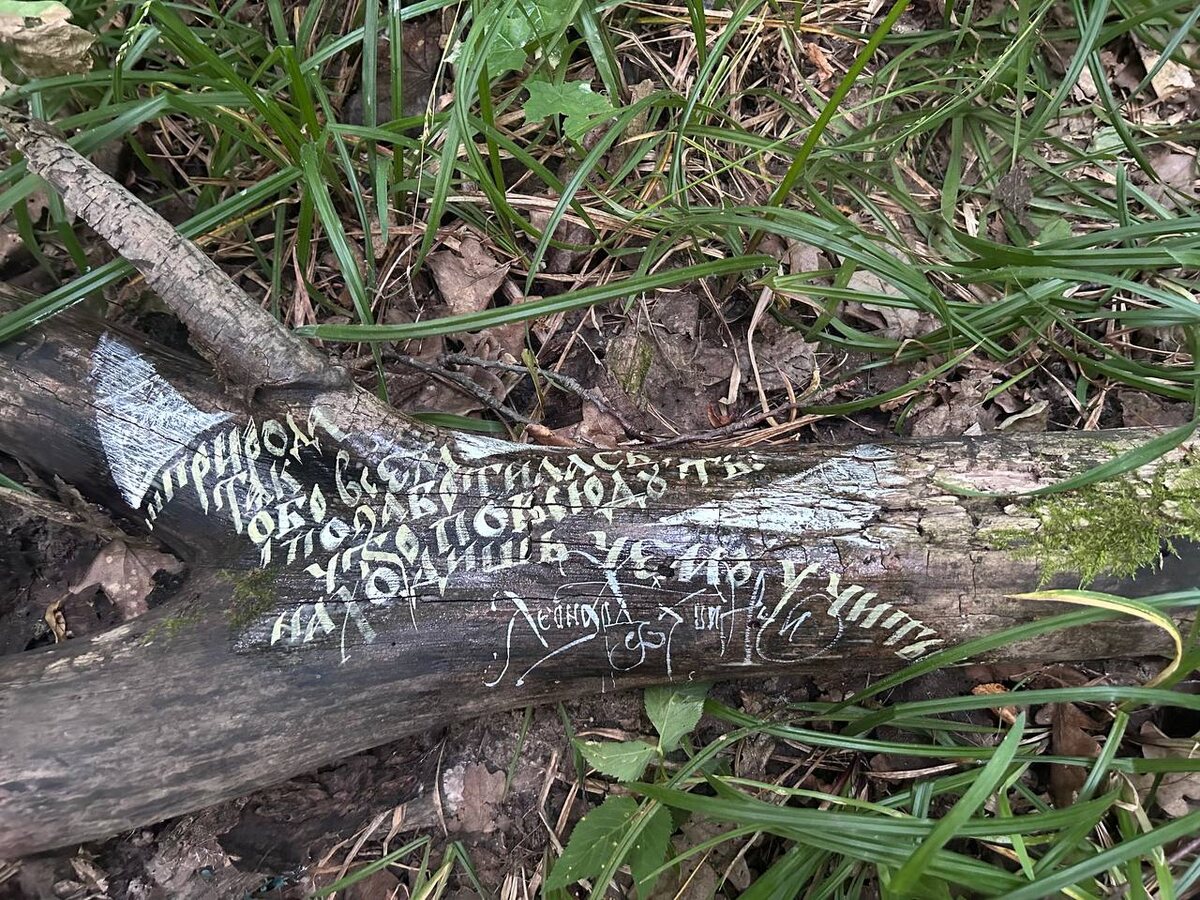 Вчера нас начали искать все казанские паблики: «Дирекция парков Казани ищет анонимного художника, который расписал каллиграфией деревья в парке». Дорогая Дирекция, это были мы, точнее — каллиграфический десант Школы ремесел. В июле на каллиграфический пленэр к нам уже во второй раз приехали ученики из разных городов России — в большинстве не профессиональные художники, а любители, которые пришли в русскую каллиграфию для души. В один из дней пленэра наш мастер каллиграфии Владислав Геннадьевич Баранов предложил «похулиганить» в Горкинско-Ометьевском лесу. Вот и похулиганили! Работали около 3 часов и сделали 15 надписей. Каждый написал свою фразу, шрифты разные, но все — из русской каллиграфии: вязь, устав, скоропись. Шрифты изучали в нашей онлайн-школе в течение нескольких лет. Надписи «разбросаны» на одном участке парка, в основном — на поваленных деревьях и пнях. Я вижу, что посетителям и Дирекции парка эта хулиганская затея пришлась по душе. Хорошо) Думаю, наш каллиграфическ