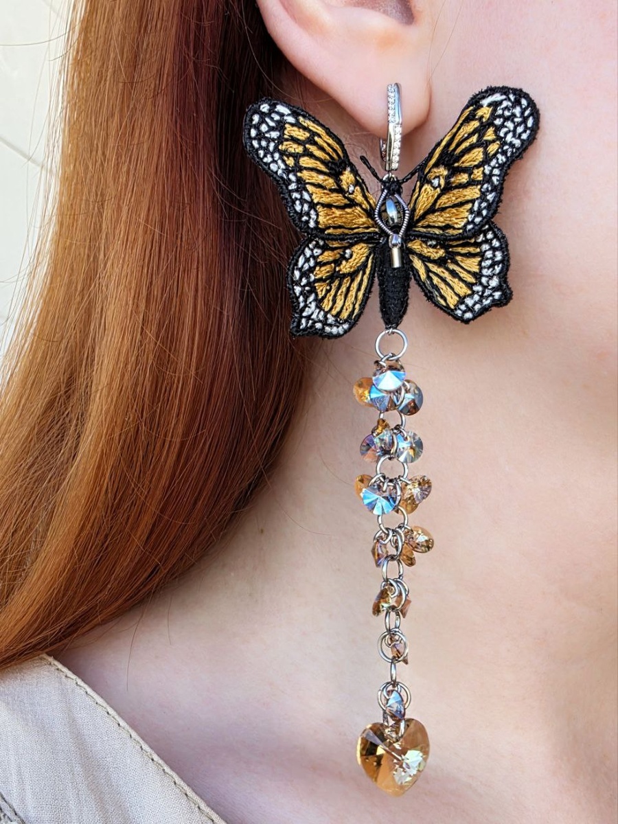 Повтор моей работы 5-летней давности, но просьба была их уменьшить. Вот кажется, что повтор. И делаешь то же самое, но, когда я положила рядом прототип и эту пару, то визуально мастерство заметно выросло. Серьги уменьшены примерно в полтора раза: для этого я взяла тонкие нити, чтоб сделать более изящную вышивку, отказалась от готового тельца в пользу так же вышитого, сделала чуть компактнее хвост. Обратите внимание на фото, где сережках на пальчиках, тельце меньше 3х сантиметров в длину!