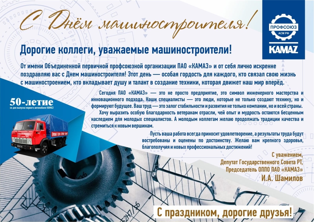 Дорогие коллеги, уважаемые машиностроители! От имени Объединенной первичной профсоюзной организации ПАО «КАМАЗ» и от себя лично искренне поздравляю вас с Днем машиностроителя! Этот день — особая гордость для каждого, кто связал свою жизнь с машиностроением, кто вкладывает душу и талант в создание техники, которая движет наш мир вперёд. Сегодня ПАО «КАМАЗ» — это не просто предприятие, это символ инженерного мастерства и инновационного подхода. Наши специалисты — это люди, которые не только создают технику, но и формируют будущее. Ваш труд — это залог стабильности и развития не только компании, но и всей страны. Хочу выразить особую благодарность ветеранам отрасли, чей опыт и мудрость остаются бесценным наследием для молодых специалистов. А молодым коллегам желаю продолжать традиции качества и стремиться к новым вершинам. Пусть ваша работа всегда приносит удовлетворение, а результаты труда будут востребованы и оценены по достоинству. Желаю вам крепкого здоровья, благополучия и новых проф