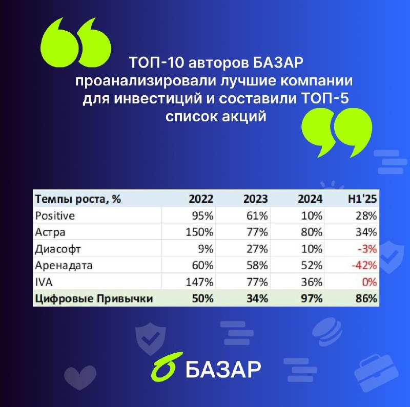 Саша, а ты знаешь, какие акции могут обогнать индекс Мосбиржи в 2026 году? Топ-10 авторов БАЗАР составили список, и среди лидеров — Цифровые Привычки (DGTL). Компания стремительно набирает обороты, и цифры за I полугодие 2025 впечатляют: Контракты: 7,7 млрд ₽ (+82% г/г) Выручка: 710 млн ₽ (+86% г/г) Чистая прибыль: 233 млн ₽ (+530% г/г) Прогнозная цена держится в районе 48 ₽, а при снижении ставок апсайд может быть значительно выше. 💡 Дополнительный плюс: компания базируется в Сколково, поэтому новая поправка на НДС для IT-сектора её не затрагивает, Цифровые Привычки платят 0% НДС. Цифровые Привычки редкий эмитент, который ведёт открытый диалог с инвесторами прямо в БАЗАР. 👉 Зарегистрируйся в БАЗАР и подпишись на Цифровые Привычки, чтобы получать аналитику из первых рук.