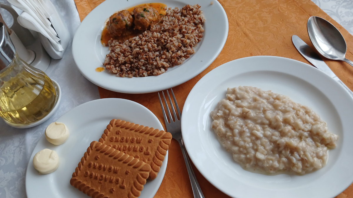 4 октября ЗАВТРАК салаты: морская капуста и лечо каша была овсяная двух видов - на молоке и на воде горячее - тефтели из говядины и гречка. Гарниры я не ем. к чаю - печенье и сливочное масло ОБЕД закуска - селедка на первое был борщ, но я не ела. И так слишком много еды на второе у меня чахохбили из курицы с гречкой. Гарнир тоже не ела. Но брала тушеную свеклу. Ела курицу со свеклой. Яблоки здесь роскошные - сочные, сладкие, крупные. Что за сорт - не знаю. Пайков сегодня столько же, как в прошлые выходные. На субботу и воскресенье очень многие выезжают на экскурсии. Две полные тележки пайков. В черных пакетах пайки на целый день, в светлых - паёк вместо обеда или ужина. ПОЛДНИК сегодня у нас по плану на полдник пирожные с кофе 🤗🤗🤗 Конечно, пошли в "Эрмитаж". И сегодня выходной, был полный аншлаг в кондитерской. Мы успели занять чудесное место у окошка, а потом уже людям выбирать не приходилось. На кондитерскую напишу отдельно обзор. Снова объелись пирожными 🤗 и еще забрали