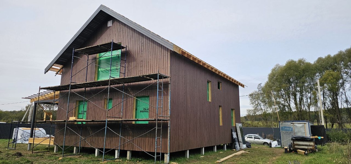 Строительство каркасного дома проекта Краснодар с изменённой планировкой дома. Идёт внешняя отделка дома, имитация бруса карельский профиль с вертикальным монтажом . Наш сайт www.biznes-stroi.ru