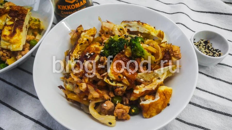 Всем привет. Сегодня приготовим китайский вариант эдаких макарон «по-флотски». Возьмём пшеничную лапшу удон, добавим мясной фарш, соус, овощи, все термически обработаем, смешаем и подадим. Будет быстро, но вкусно и сытно! Продуктовый набор: Лапшу отвариваем в кипящей подсоленной воде в течение 5 минут, откидываем на дуршлаг, промываем кипятком. Яйца разбиваем в миску, добавляем щепотку соли, пару ст. л. воды, взбалтываем. Нагреваем сковороду, добавляем немного растительного масла, выливаем половину яичной смеси, распределяем по дну, готовим до схватывания, сворачиваем рулетом, оставив пару сантиметров, сдвигаем свернутой частью к краю, на свободное место наливаем оставшeюся смесь, жарим до готовности, сворачиваем рулетом до конца, откладываем на доску. Нарезаем ломтиками, отставляем в сторону. В сковороду добавляем немного масла, выкладываем фарш, жарим, разминая комки минуты три, вливаем оба соуса, кунжутное масло, добавляем горошек, разобранную на соцветия брокколи, перемешиваем, гот