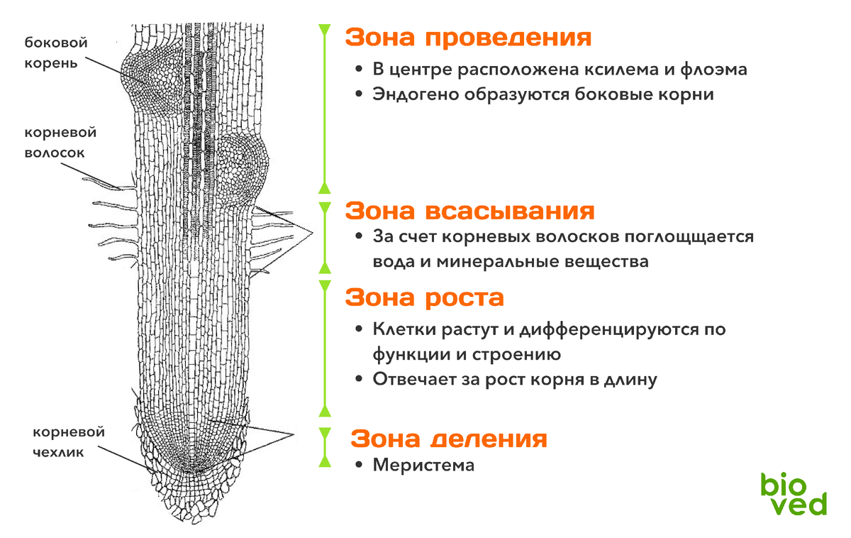 (в строении корня выделяют несколько зон и корневой чехлик, разберем подробнее)