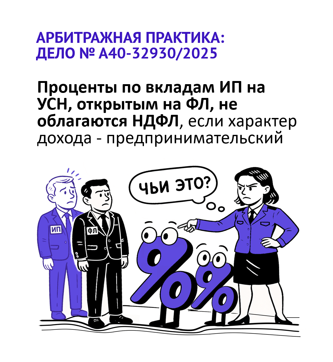 Фабула дела А40-32930/2025: Предприниматель заработал деньги от своего Бизнеса (сдачи в аренду и продажи земельных участков) и положил их на банковские вклады, открытые на своё имя как обычного физического лица. С полученных процентов он, как и положено на упрощёнке, учёл доход и был готов платить налог 6%.