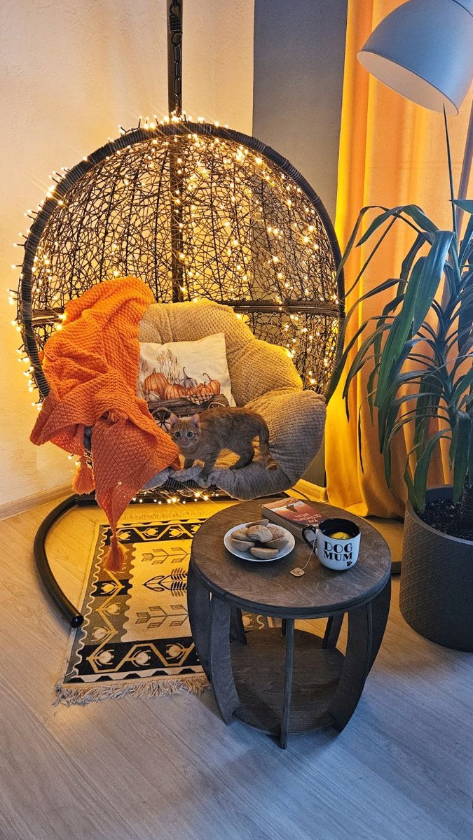 - Если намотать на любимое кресло гирлянду (ну и что, что не Новый год, а кто ж нам запретит?!), то хмарь за окном уже не задавит унылостью.