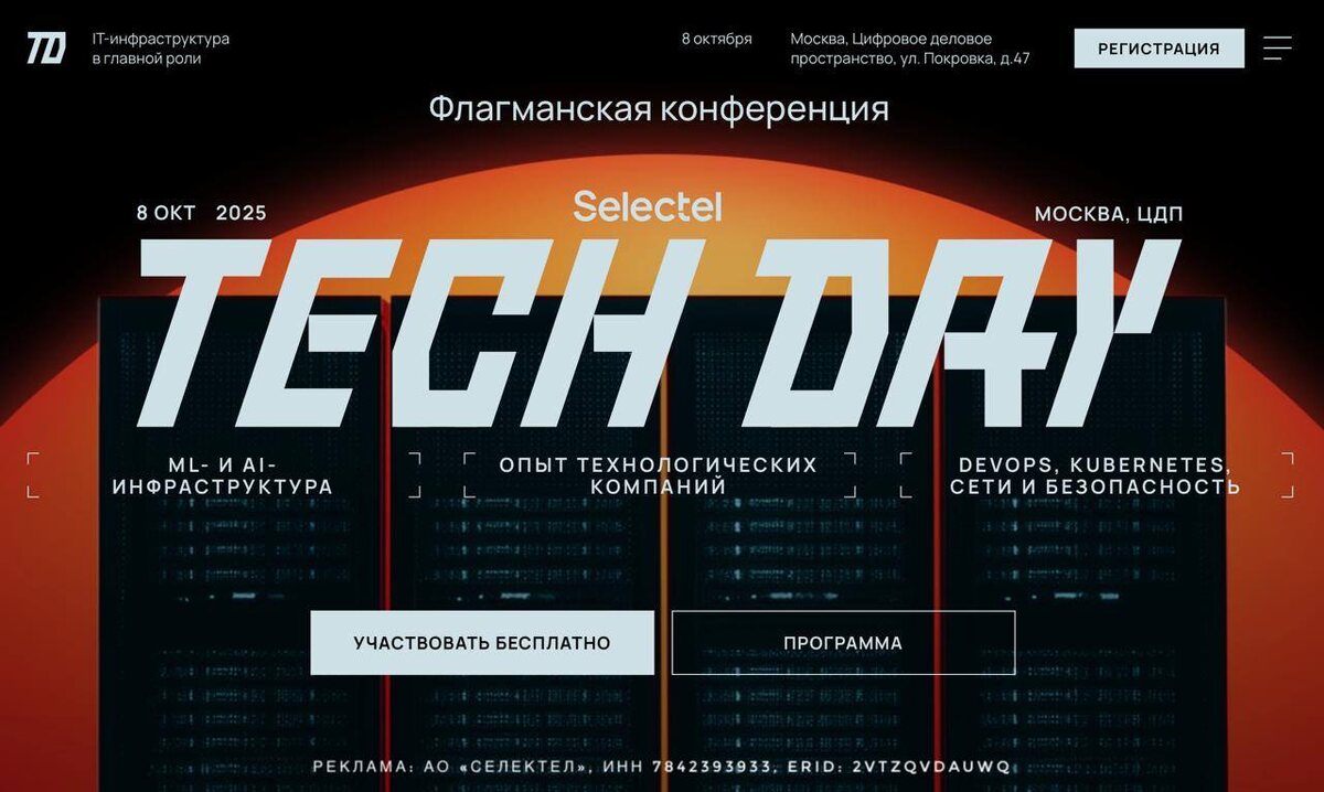 Регистрируйтесь на одно из главных IT-событий года 8 октября в Москве пройдет Selectel Tech Day — флагманская конференция одного из ведущих провайдеров IT-инфраструктуры. Присоединяйтесь, чтобы: 🔺Узнать о реальном опыте СТО и топ-менеджеров технологических компаний. 🔺Обсудить главные тренды и технологии с людьми, которые развивают IT-рынок. 🔺Познакомиться с экспертами и лично задать интересующие вопросы. Место встречи — Москва, Цифровое деловое пространство В том году Selectel Tech Day зарядил меня уверенностью, что и крупнейшие коммерческие игроки плотно идут по линии импортозамещения Буду ждать, чем удивят и обрадуют уже через 5 дней! Участие в конференции бесплатное, а времени остается совсем мало, скоро закроется регистрация, так что лучше поторопиться и зарегистрироваться! Не откладываем в долгий ящик, а ставим напоминание в календаре на 8 октября!