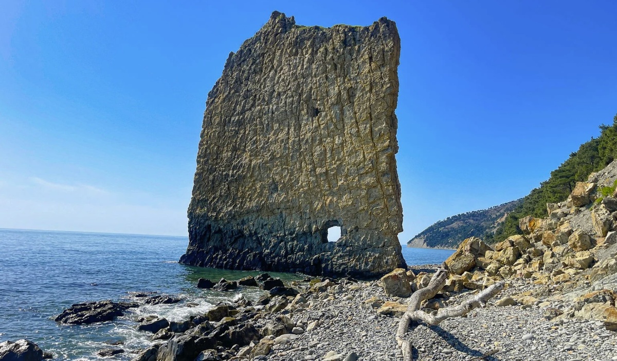 Поездка к скале Парус в Кабардинке и впечатления от прогулки по пляжу рядом. Скала выглядит как природный памятник в самом море.