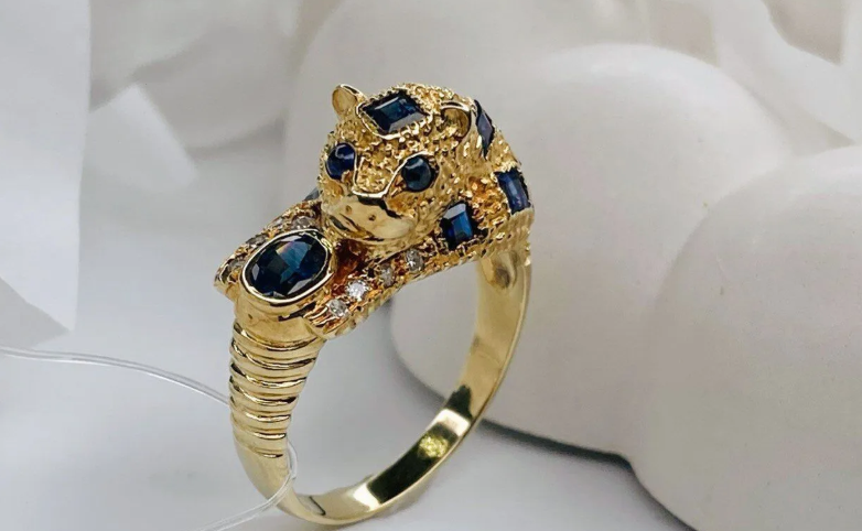 Кольцо изготовлено из желтого золота 585 пробы. В центре композиции золотой хищник, который завораживает своим глубоким взглядом и красотой. Глаза выполнены из сапфиров глубокого синего оттенка, они же украшают тело животного. Самый крупный камень он как-будто держит в лапах. Дополнительный блеск украшению придают 8 сверкающих бриллиантов.