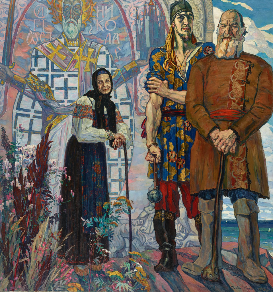 Сделаем Снова Сильной Россию! Будут тогда и культура, и хлеб. Это – закон исторической физики. Это доказано тысячей лет. Дал слабину – накликал войну. Пьяный уснул – потерял страну. Нужен ещё эксперимент? Ни права, ни смысла, ни времени нет. Драку за «правильный» патриотизм В пылу коммунальных свар Нам бы, товарищи, прекратить. Иначе пропустим удар. Эти, привыкшие держать кнут, «Лучшего мира» вожди Сомнут и не спросят, как зовут. Точно. К волхвам не ходи. П. Д. Корин «СТАРИННЫЙ СКАЗ». 1943 г. Государственная Третьяковская Галерея