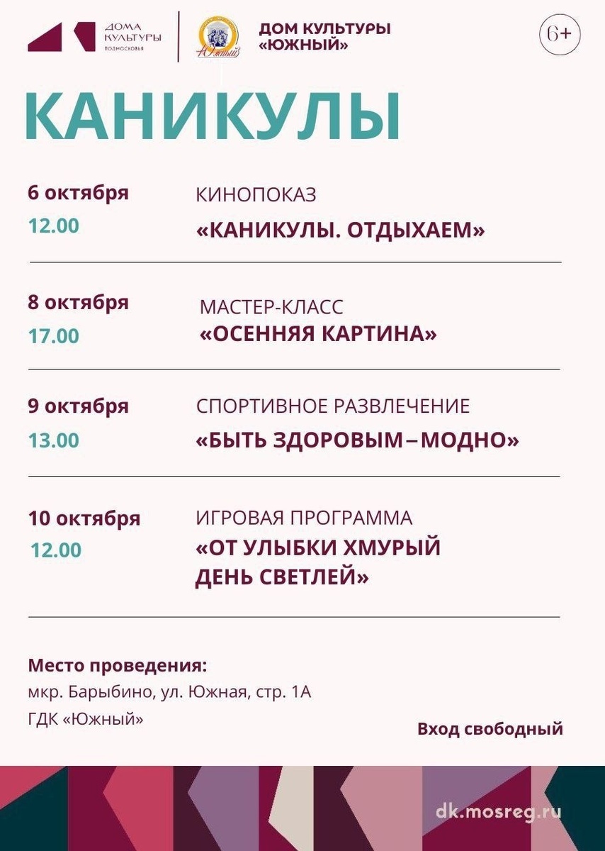 ✨ Дорогие друзья! ГДК «Южный» приглашает провести осенние каникулы вместе 🍁 Не упустите возможность получить отличное настроение, массу ярких эмоций и провести свободное время с удовольствием ✨ Ждём вас!🧡 🚫 Возраст: 6+ 🏢 Городской дом культуры «Южный» 📍 г.о.Домодедово, мкрн.Барыбино, ул.Южная, стр1А 💰 Вход свободный❗️ ✅ Мероприятия Домодедово https://dzen.ru/id/66f10385cc4c5a16f7b5fb02 http://vk.com/domodedovo_events http://dzen.ru/domodedovo_events