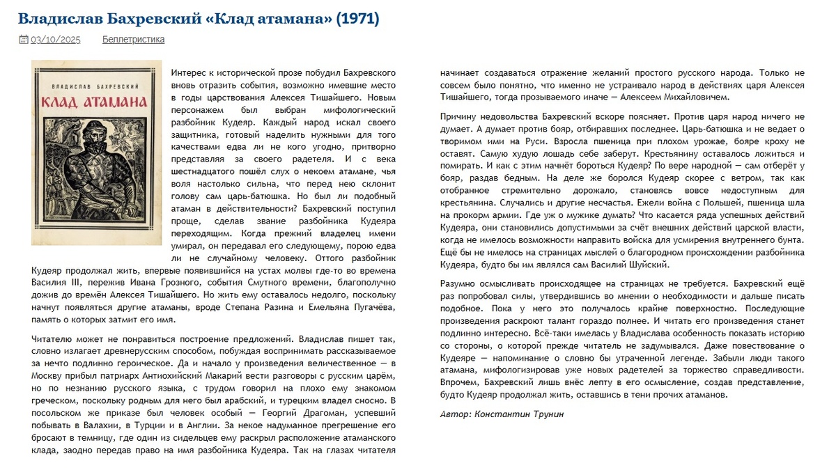Владислав Бахревский "Клад атамана" (1971) | Критика