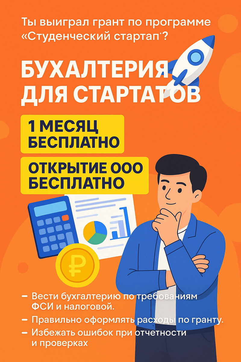 Поздравляем вас с победой! Теперь финансовая отчетность, налоги и бумажная жара — не ваша головная боль. Пусть вы фокусируетесь на развитии, а не на формулах. Что мы предлагаем: Полный бухгалтерский и кадровый учет под ключ Расчёт зарплат, налогов, взносов, договоры ГПХ, самозанятые Сдача отчетов (РСВ, НДФЛ, ЕФС и другое) Ответы на проверки, уведомления, сопровождение Оформление приёма/увольнений, отпусков, больничных 📦 Специальные условия для стартапов Первый месяц обслуживания — бесплатно Помощь в открытии ООО — бесплатно Все услуги по фиксированной цене — 6900 ₽ / мес. только до 15 октября Опыт с 2021 года именно с грантополучателями ФСИ Команда победителей конкурсов, знакомых с тонкостями взаимодействия с фондами и госорганами! Источник: urstartup.ru