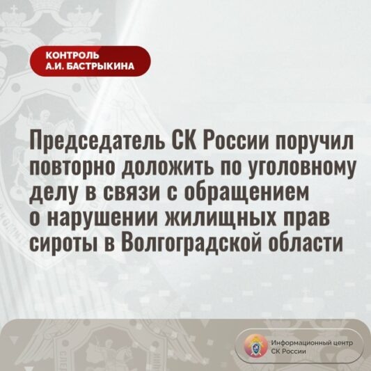 Как уточнили в приёмной председателя СК России, в прошлом году девушке предложена квартира с задолженностью по коммунальным платежам, от которой она вынужденно отказалась. Председатель Следственного комитета РФ Александр Бастрыкин поручил и.о. руководителя СУ СК России по Волгоградской области Дмитрию Буравцову представить повторный доклад о проведенном комплексе следственных действий и установленных обстоятельствах, а по завершении расследования уголовного дела — о его результатах.