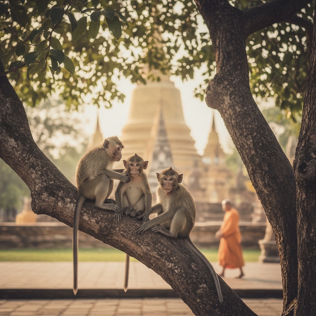 😎 настроение — 100%. Я взял завтрак с собой и решил поесть в парке у храма, где обитают десятки милых обезьян. Они так фотогенично сидели на деревьях, что я достал телефон… и вот тут начался сюжет фильма про ограбление. Стоило мне отвлечься на фото, как из кустов выскочил маленький пушистый ниндзя. С ловкостью акробата он прыгнул на лавку, схватил пакет с моим завтраком и… был таков! Я попытался вернуть своё имущество. Громко: