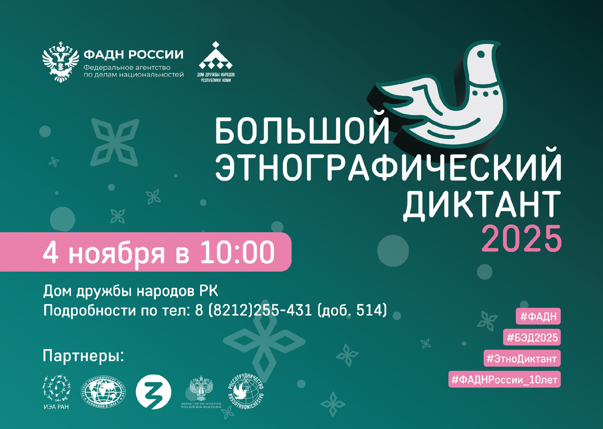 С 1 по 8 ноября 2025 года Федеральное агентство по делам национальностей совместно с партнёрами проводит X Всероссийскую просветительскую акцию «Большой этнографический диктант». Юбилейная, десятая по счёту акция направлена на укрепление общероссийской гражданской идентичности, популяризацию традиционных российских духовно-нравственных ценностей и борьбу с фальсификацией истории. Ежегодно жители Республики Коми активно участвуют в Акции. В 2024 году свой уровень этнографической грамотности проверили более двух тысяч человек. «Большой этнографический диктант» — это уникальная возможность для жителей России и зарубежья проверить свои знания о традициях, языках, истории и культуре народов, населяющих нашу страну. Участие в диктанте объединяет людей разных возрастов, профессий и национальностей, подчеркивая ценность культурного многообразия и единства России. Традиционно Акция пройдёт в двух форматах: В Год защитника Отечества и впервые в истории диктанта участники специальной военной опер