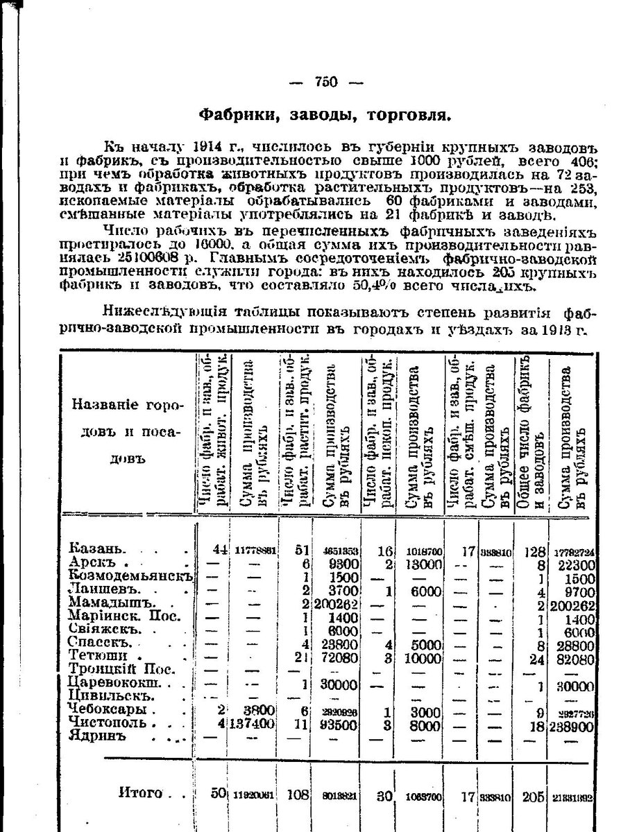Адрес-календарь Казанской губернии на 1915 год. стр. 750 Сведения по крупным заводам и фабрикам с производительностью свыше 1000 рублей в год. Мариинский Посад: - число фабрик и заводов, обрабатывающих растительную продукцию- 1, сумма производства в рублях- 1 400. Чебоксары: - число фабрик и заводов, обрабатывающих животную продукцию- 2, сумма производства в рублях- 3 800, - число фабрик и заводов, обрабатывающих растительную продукцию- 6, сумма производства в рублях- 2 920 926, - число фабрик и заводов, обрабатывающих ископаемую продукцию- 1, сумма производства в рублях- 3 000. Цивильск – крупных заводов нет. Ядрин – крупных заводов нет. стр.752 Сведения по мелким заводам за 1913 год. Мариинский Посад – 2. Цивильск – 0. Чебоксары – 36. Ядрин - 26. Сведения по ярмаркам за 1913 год. стр. 755 Цивильск: Тихвинская ярмарка – обороты в рублях- 36 800, 22 июня -1 июля. Цивильск: Ильинская ярмарка – обороты в рублях- 6 200, 20 июля. Шихазаны: Девятая пятница по Пасхе - обороты в рублях- 40 0