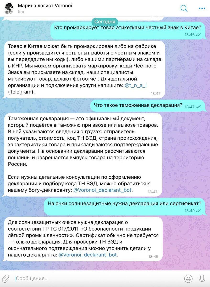 Сегодня - немного подробнее о том, как работает наш AI-логист Марина. Мы видим ваши диалоги с ней каждый день и радуемся, что вы используете её не ради эксперимента, а по делу. Чтобы ответы Марины были максимально точными - вот пара правил: • При расчёте логистики пишите всё в одном сообщении: название товара, вес и объём партии (не штуки), город отправки в Китае и город получения в России. • При расчёте таможенных платежей: точное название товара и его подробное описание (для подбора кода ТН ВЭД), стоимость логистики (авто или ЖД, рассчитанная Мариной) и закупочная стоимость партии с валютой (юань или доллар). И помните - Марина не только считает. Она консультирует: этапы белого ввоза, нужные документы, допуслуги. Спрашивайте её так же, как спросили бы менеджера или меня. Чем больше вопросов - тем больше понимания о белой логистике. https://t.me/Voronoi_info_bot
