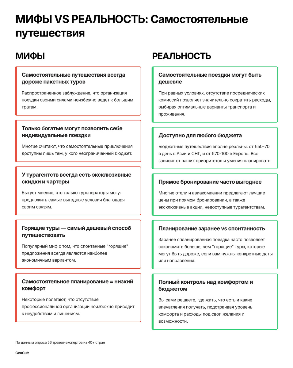 Таким образом, миф о том, что самостоятельные поездки всегда дороже, опровергается большинством экспертов. Ключевое преимущество самостоятельного путешествия — не экономия, а свобода выбора и персонализация, а итоговая стоимость сильно зависит от умения планировать и приоритетов путешественника