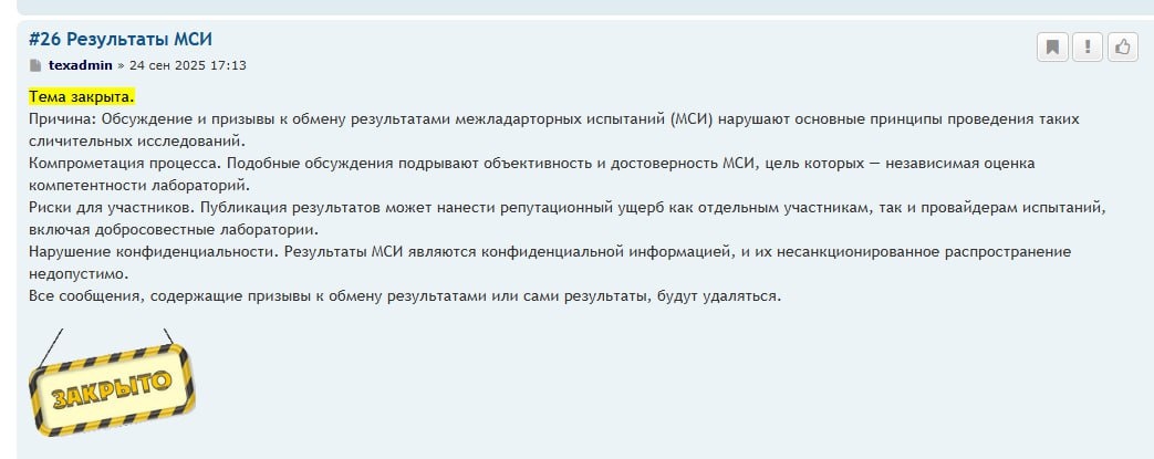 https://rosakkreditatsiya-forum.ru/viewtopic.php?f=11&t=1804 Закрываем тему "Результаты МСИ" навсегда Причина: Обсуждение и призывы к обмену результатами межладарторных испытаний (МСИ) нарушают основные принципы проведения таких сличительных исследований. Компрометация процесса. Подобные обсуждения подрывают объективность и достоверность МСИ, цель которых — независимая оценка компетентности лабораторий. Риски для участников. Публикация результатов может нанести репутационный ущерб как отдельным участникам, так и провайдерам испытаний, включая добросовестные лаборатории. Нарушение конфиденциальности. Результаты МСИ являются конфиденциальной информацией, и их несанкционированное распространение недопустимо. Все сообщения, содержащие призывы к обмену результатами или сами результаты, будут удаляться.