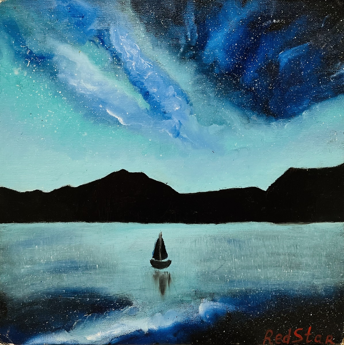 «На пути к мечте» — картина, написанная маслом на грунтованном картоне размером 25 на 25 см в 2021 году. Эта работа захватывает дух и переносит зрителя в магический мир ночного океана, освещённого мерцающими огнями северного сияния. Небо переливается бирюзовыми, зелёными, синими и чёрными оттенками, создавая мистическую атмосферу, где мечты кажутся близкими и возможными. На фоне этого завораживающего светового шоу, маленький парусник уверенно плывёт через тёмные воды океана. Его путь — это символ веры и стремления к своей мечте, несмотря на ночную тьму и безбрежную воду. Каждый мазок передаёт чувство спокойной решимости, которая ведёт вперёд, даже когда дорога неизвестна. Эта картина вдохновляет на путешествие вглубь себя, к самым заветным мечтам и целям. "На пути к мечте"— это напоминание, что даже в самые тёмные ночи всегда есть свет, который ведёт нас вперёд, если мы достаточно смелы, чтобы следовать за ним. Это полотно принесёт в ваш дом атмосферу мистической красоты и вдохновения