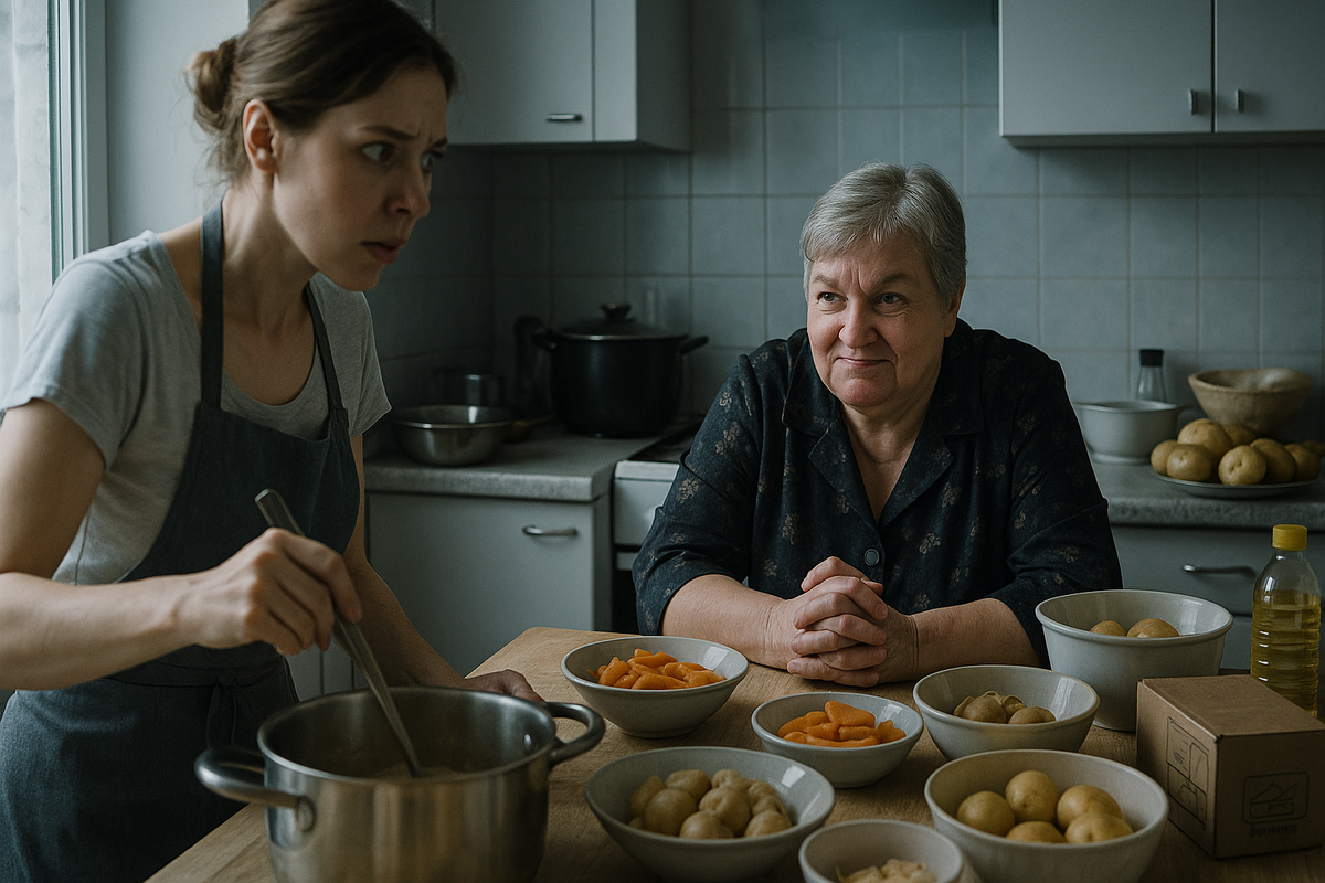 На кухне Инна включила свет и оглядела пространство. Вчера вечером свекровь привезла продукты — огромные пакеты с мясом, овощами, зеленью, специями. Всё это теперь занимало половину столешницы и весь холодильник. Инна вздохнула и принялась доставать ингредиенты.