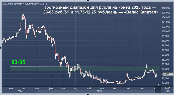 Прогнозный диапазон для рубля на конец 2025 года — 83-85 руб./$1 и 11,75-12,25 руб./юань — «Велес Капитал» Курс доллара к рублю расчётный, фьючерс, вечный фьючерс и межбанк. Курс евро к рублю расчётный, фьючерс, вечный фьючерс и межбанк. Курс юаня к рублю биржевой, фьючерс, вечный фьючерс и межбанк. Прогнозный диапазон для рубля на конец 2025 года составляет 83-85 руб./$1, 97-99 руб./EUR1 и 11,75-12,25 руб./юань, сообщается в стратегии инвесткомпании «Велес Капитал» на четвертый квартал 2025 года. «В начале сентября продажи рубля резко усилились, - пишут эксперты. - Однако этот период, скорее, отражал уже локальное усиление потребности в валюте отдельных крупных игроков. После удовлетворения потребности в валютной ликвидности баланс на рынке быстро восстановился». До конца текущего года аналитики ожидают сохранения давления на рубль со стороны торгового баланса. По их мнению, ухудшений условий внешней торговли в виде сжатия экспорта (в том числе из-за санкционных ограничений) и постепе