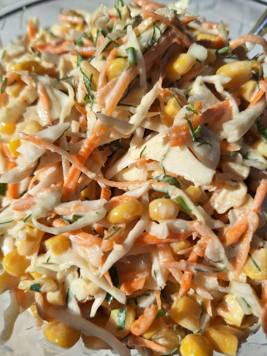 Морковь натереть на терке для корейской морковки. Капусту тонко нашинковать. Укроп и петрушку нарезать ножом. Все перемешать и добавить кукурузу. Заправка :
