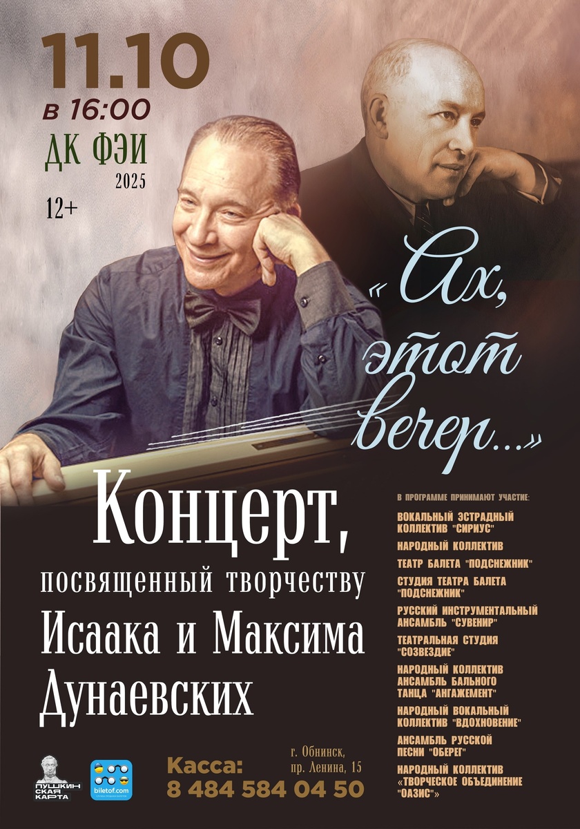 🎶11 октября в 16:00 в ДК ФЭИ состоится праздничный концерт, посвящённый творчеству Исаака и Максима Дунаевских. Вечер прекрасной музыки двух композиторских поколений, давшей стране заряд оптимизма на несколько веков вперёд. Есть музыка, определившая тонус времени. Отцу и сыну Дунаевским удалось создать именно такую музыку. Программа «Ах, этот вечер», подготовленная коллективами «ДК ФЭИ», — это связь времён, выраженная в песнях, которые в прямом смысле слова знает, любит и поёт вся страна. Из кино и с эстрады они шагнули в наши квартиры и повседневную жизнь. Это «золотой запас» нашей культуры, который надо бережно передавать следующим поколениям. 🎟Билеты в кассе (Вт-Сб с 13:00 до 19:00) или онлайн по ссылке: https://biletof.com/action/?ra=17041&frame=1. ❗️БИЛЕТЫ ПО ПУШКИНСКОЙ КАРТЕ ПОЯВЯТСЯ ПОЗЖЕ❗️ Обнинск, пр-т Ленина, 15. 👍 Подписаться | Ваша реклама