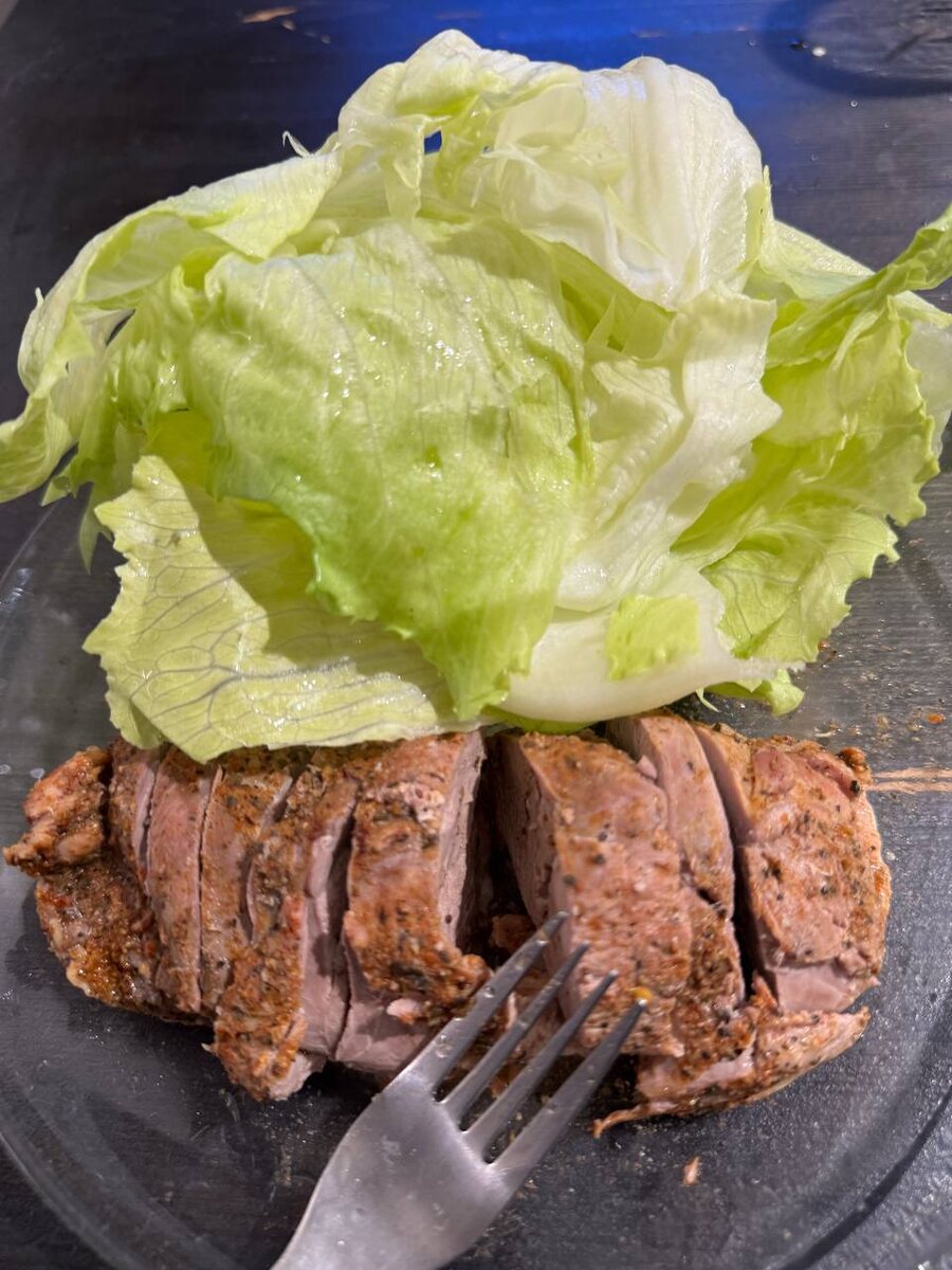 И кето-ужин. Утиная грудка, запеченная в фольге (просто натерла нашедшимися специями с солью, завернула в фольгу и запекала 40 минут, потом дала ей отдохнуть минут 8) И салат Айсберг.