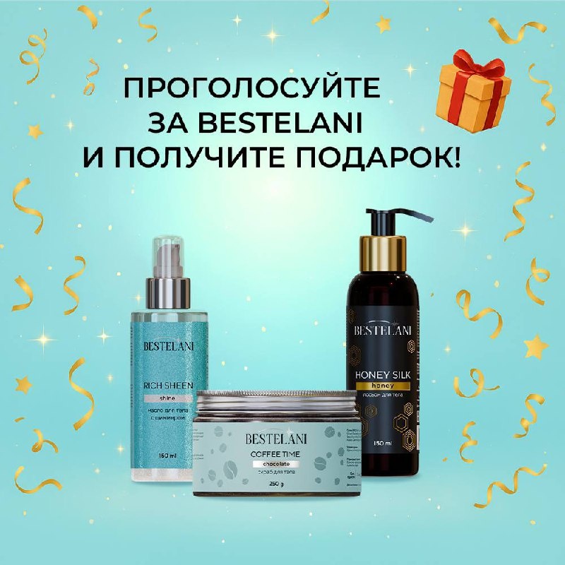 🎉 КОНКУРС ВКОНТАКТЕ ОТ BESTELANI — ПОЛУЧИ ГАРАНТИРОВАННЫЙ ПОДАРОК! 🎁 Друзья, мы запустили супер-акцию во ВКонтакте — проголосуйте за Bestelani и получите любой продукт из списка в подарок! 💜 🗳 Участвовать очень просто: 1. Проголосуйте за нас в премии на сайте: http://pcar.ru/award/vote 2. Сделайте скриншоты, подтверждающие голосование 3. Отправьте их нам в ЛС ВКонтакте + укажите, какой подарок хотите 🎁 4. Подпишитесь на нашу рассылку: https://vk.cc/cPPtpi 🎁 На выбор: * SPF 30 / SPF 50 * Гель или масло после загара * Масло с шиммером * Медовая серия (гель и лосьон) * Кофейный скраб * Бальзам для волос 📅 Успей до 6 октября! ⚠ Подарков ограниченное количество — кто первый, тому и beauty-бонус! 😉 👉 Подробности в нашем ВК