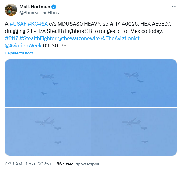 Фотографу Мэтту Хартману удалось сделать снимок двух снятых с вооружения истребителей F-117A Nighthawk в полёте. Их дозаправка в воздухе осуществлялась самолётом KC-46 Pegasus. Nighthawk в 2008 году был официально снят с вооружения ВВС. Истребитель-невидимка F-117A. Фото: ВВС СШАПредполагается, что F-117 может вернуться в строй — либо для патрулирования границы с Мексикой, либо для борьбы с венесуэльскими картелями в Мексиканском заливе. После снятия Nighthawk с вооружения некоторые самолёты были демилитаризованы и переданы в музеи. Остальные хранились на испытательном полигоне Тонопа в Неваде, также известном как «Зона 52». F-117 хранятся в «Зоне 52». Фото: ВВС СШАОднако очевидцы неоднократно сообщали, что F-117 время от времени совершал полёты. В 2019 году самолёт был замечен за пределами Невады, а именно в Калифорнии. Там он отрабатывал полёты на малой высоте на маршруте Sidewinder Low Level Route, тренировочном коридоре США в калифорнийской пустыне. С 2021 года Nighthawk получил ра