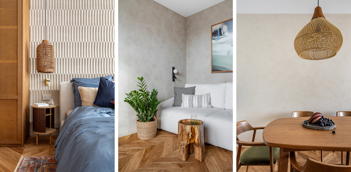 Несмотря на компактные размеры, атмосфера здесь балийская. Светлые оттенки визуально расширяют пространство, а деревянные детали — тот самый столик и шпонированный оконный портал — добавляют тепла. Декоративная штукатурка в природной гамме поддерживает настроение интерьера, а скрытая арочная дверь становится изящным акцентом и продолжением общей концепции квартиры.