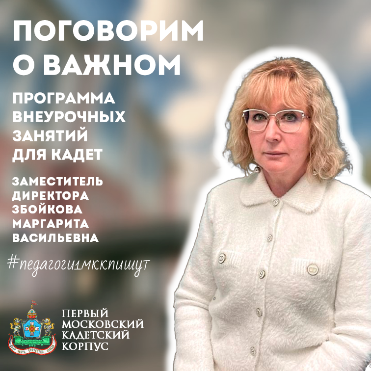 📖 В проекте «Наши лица» заместитель директора Первого Московского кадетского корпуса по воспитанию, социализации и безопасности обучающихся Маргарита Васильевна Збойкова расскажет о новой программе внеурочных занятий, которые проходят в Корпусе в рамках занятий «Разговоры о важном»
