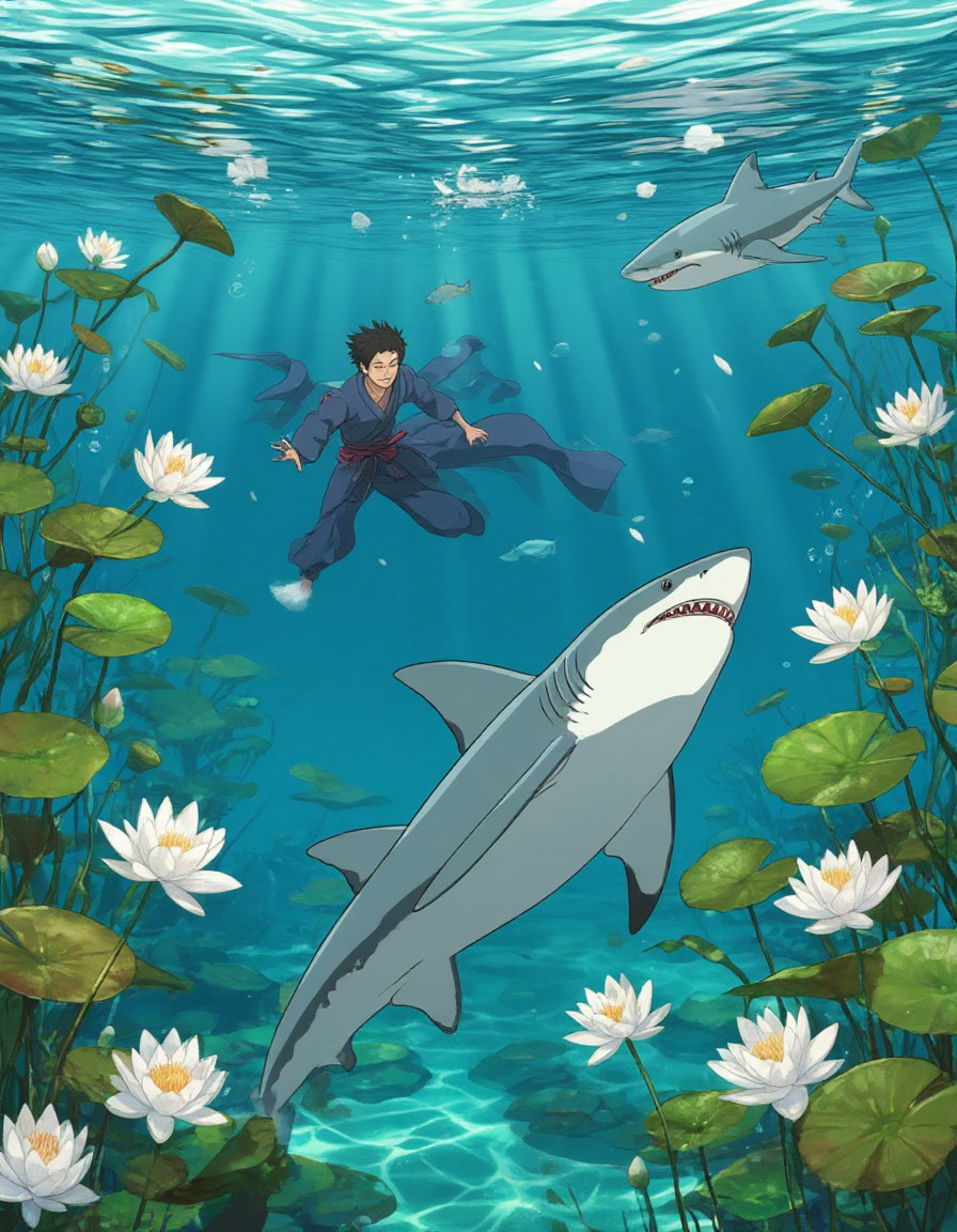 *из рассказов местных жителей. Подборка и перевод - мой. В старину далёкую, плыл самурай по лазурному морю в края незнакомые. Корабль его, подгоняемый попутным ветерком, легко скользил по зыбким волнам, словно лебедь белокрылый. Но вдруг замер он на месте, будто в сказочном сне, не в силах сдвинуться ни на пядь. «Верно, — молвил кормчий, — проглотила акула морская чью-то тень с нашего судна. Испытаем судьбу: пусть каждый бросит в воду полотенце своё. Чьё на дно уйдёт — того тень в глубине сокрыта». Бросили люди полотенца свои — и поплыли они, будто белые кувшинки, по хрустальной глади. Лишь одно, самураево, тихо потонуло, унесённое таинственной силой со дна. «Ступай же, добрый воин, — взмолились спутники, — утоли чудовище, иначе всем нам не сдобровать». И смирился самурай с своей судьбой, готовый принести жертву морской пучине. Подошёл он к самому краю корабля и увидел в бирюзовой воде исполинскую акулу, что лежала в ожидании, раскрыв жемчужные чертоги пасти своей. Но не дрогнула рука