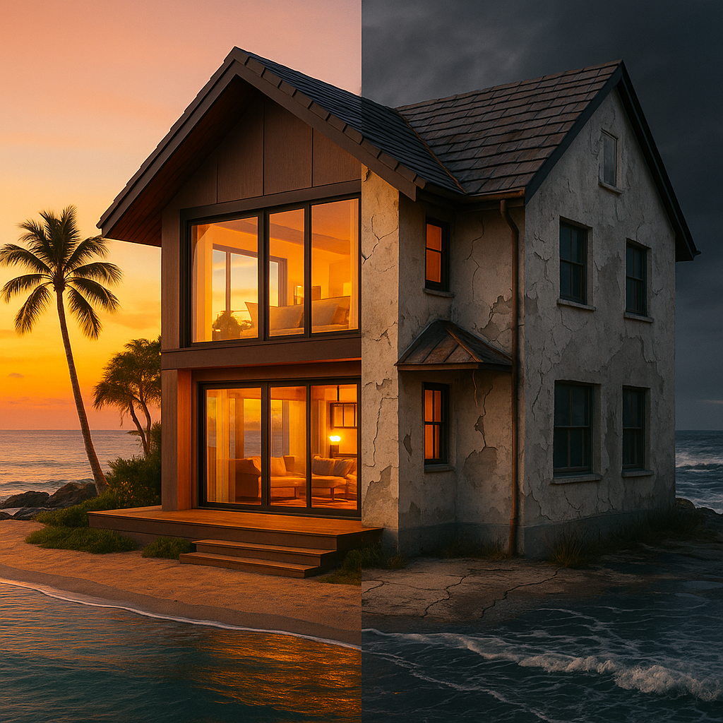 На картинке всё выглядит идеально: белый домик, терраса с видом на волны, чашка кофе в руках и рассвет, который каждый день начинается у тебя за окном. Именно так рисуют мечту о доме у моря. Но что на самом деле ждёт тех, кто решается купить жильё у побережья? Первая встреча с реальностью: влажность Море красиво, но оно беспощадно к вещам. Через пару месяцев в квартире появляется запах сырости, мебель разбухает, техника покрывается налётом, а металлические детали начинают ржаветь. Особенно страдают кухни и санузлы — там влажность чувствуется сильнее всего. Ты можешь любоваться закатом, но одновременно вытирать конденсат с окон и бороться с плесенью в углах. Вторая проблема: сезонность Летом побережье живёт. Туристы, кафе, ярмарки, набережная — всё кипит. Но стоит сентябрю закрыть сезон, и городок превращается в полупустой. Магазины работают с сокращённым графиком, многие кафе просто закрываются, а зимой улицы кажутся вымершими. Для отдыха приезжать — здорово. Но жить круглый год