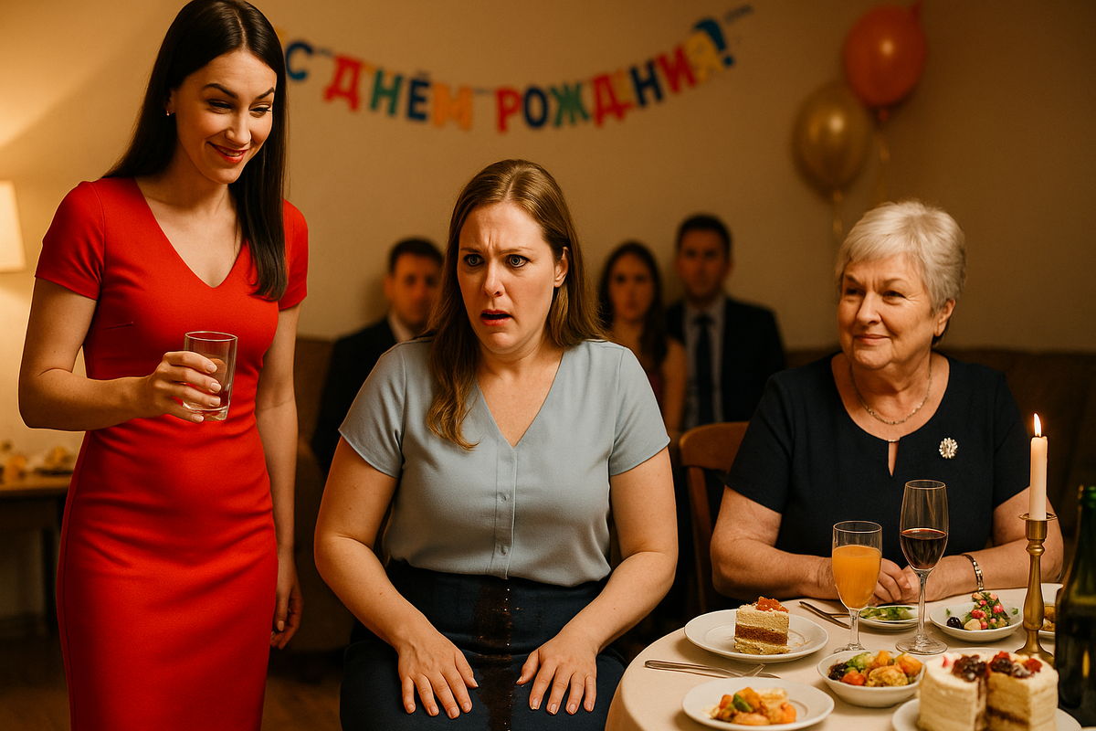 Анастасия вскочила. Холодная жидкость растеклась по ногам, брюки прилипли к коже. В комнате воцарилась тишина. Кто-то ахнул. Дядя Виктор застыл с вилкой на полпути ко рту. Тётя Людмила прикрыла рот ладонью. Раиса Степановна побледнела.
