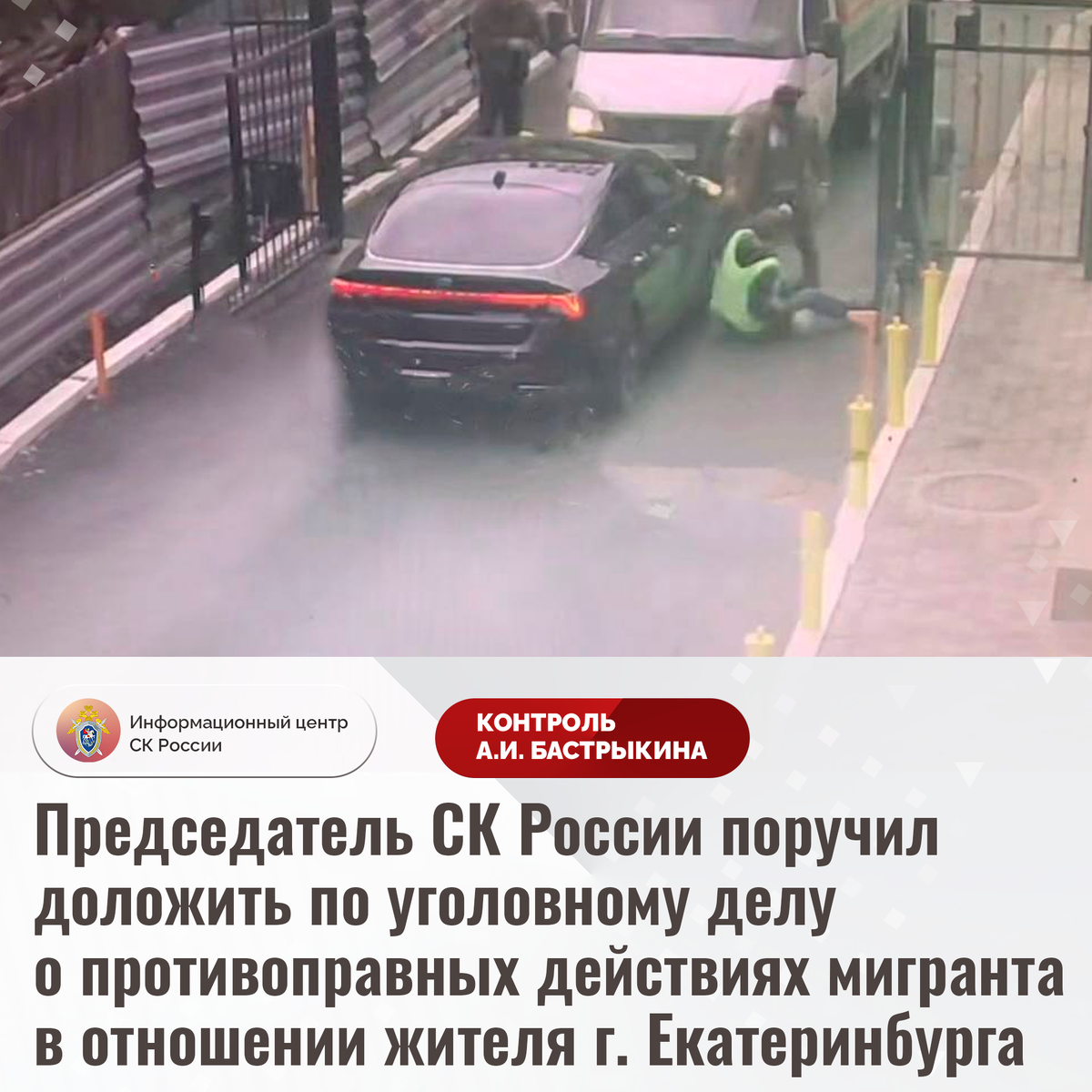Председатель СК России поручил доложить по уголовному делу о противоправных действиях мигранта в отношении жителя г. Екатеринбурга В телеграм-канале сообщается, что в октябре текущего года в городе Екатеринбурге мигрант в ходе дорожного конфликта нанес несколько ударов по голове мужчине, в результате чего последний упал. Пострадавший получил телесные повреждения. Ситуация освещается в СМИ и социальных сетях. В СУ СК России по Свердловской области возбуждено уголовное дело. Председатель Следственного комитета Российской Федерации Александр Иванович Бастрыкин поручил руководителю СУ СК России по Свердловской области Богдану Валерьевичу Францишко доложить об установленных в ходе проведенных следственных действий обстоятельствах, а по завершении расследования – о его результатах. Исполнение поручения поставлено на контроль в центральном аппарате ведомства. #СледственныйКомитет #СКРоссии #СКР #ИЦСКР #ИнформационныйЦентр #АлександрБастрыкин #ПредседательСКР #КонтрольПредседателяСКР #Коммента