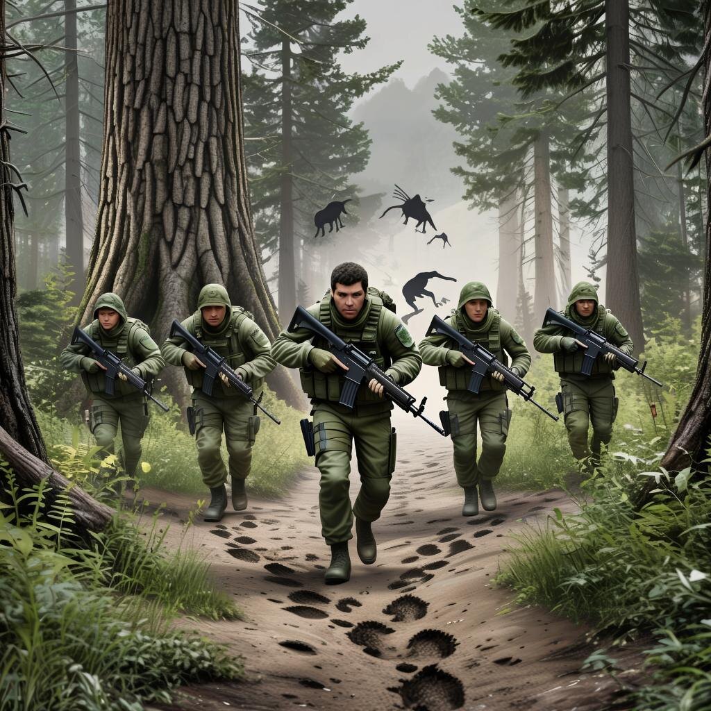 Они оказались в густом лесу, окруженном высокими деревьями и кустарниками. Воздух был свежим и чистым, пахло травой и цветами. Но вскоре бойцы заметили признаки опасности: следы животных и звуки, свидетельствующие о присутствии крупных хищников.
