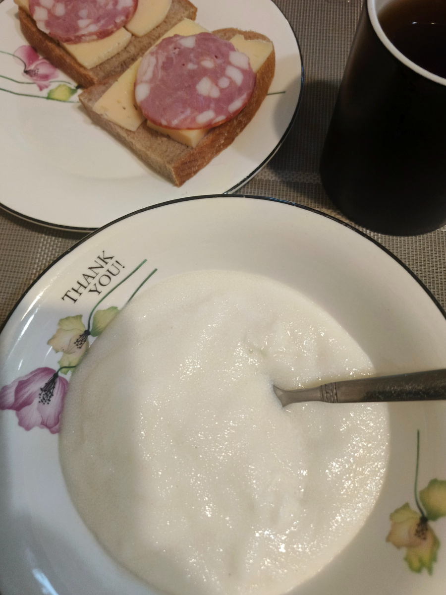Снова каша, но на этот раз с медом и бутербродами. Все каши готовлю на воде пополам с молоком, масло добавляю только изредка.