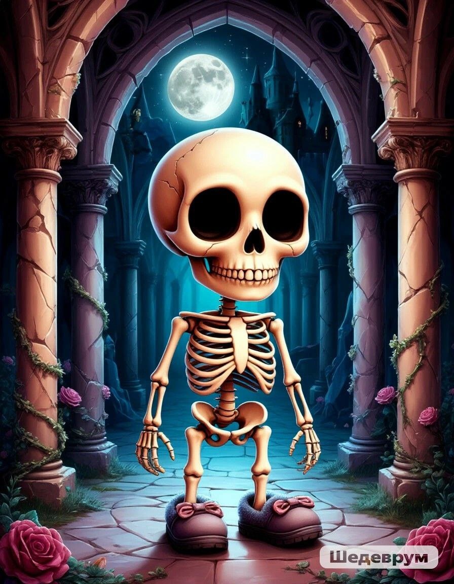 В хрустальных лабиринтах вечности, где лунный свет вырисовывал причудливые арабески на костяных сводах замка, обитал скелет по имени Щёк. Он не был мрачным владыкой преисподней или зловещим хранителем тайн. Щёк был…милым. Его облик, лишённый плоти и крови, таил в себе нежность и какую-то утончённую грусть. В пустых глазницах отражался бескрайний космос, а костяная ухмылка словно шептала о забытых радостях.