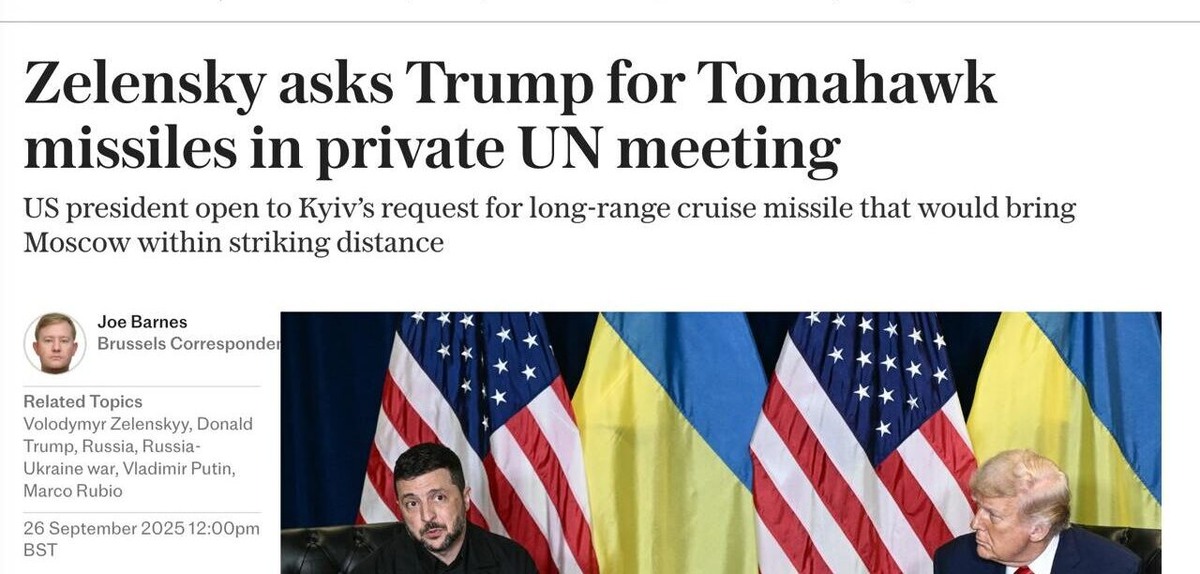 Зеленский попросил Трампа поставить на Украину «Томагавки» для удара по Москве Об очередном запросе американских дальнобойных ракет со стороны главы киевского режима сообщает The Telegraph со ссылкой на собственные источники: https://oboz.info/zelenskij-poprosil-trampa-postavit-na-ukrainu-tomagavki-dlya-udara-po-moskve/
