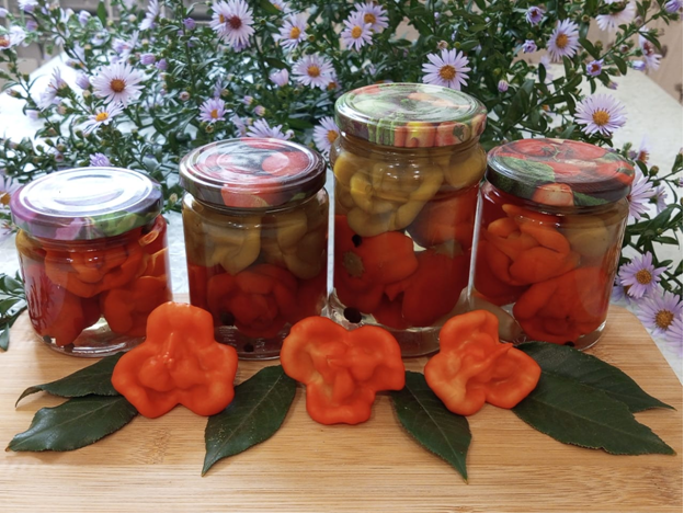 Впервые в этом году закрутила две партии острого перчика на зиму, но у меня не совсем острый перец, средне острый, толстостенный, очень красивый под названием «Новогодний спрут». В первую партию добавляла 3 ложки сахара, мы его попробовали, нам очень понравилось, но вторую партию мне захотелось послаще, добавила 4 ложки сахара. Ингредиенты на банку 300 мл: - Перец острый, если новогодний спрут примерно 8-9 шт.; - очищенный чеснок – 1 зубчик; - перец черный горошком – 2 шт.; - перец черный душистый – 1шт. По моему мнению, для острого перца ничего больше и ненужно. Рассол: - вода – 1 литр; - соль – 1 ст. ложка с небольшим бугром; - сахар – 3 или 4 ст. ложки с небольшим бугром; - уксус 70% – 1 неполная ст. ложка. Одного литра рассола хватит на 4 баночки 300 или 500 м., или на 2 литровые, или уксус можно добавлять в банки, перед тем как залить рассол: Расход 70% уксуса на банку. Банки: - 600мл. – 1 литр – 1 чайная ложка 70% уксуса; - 1.5 литровые – 1 десертная ложка 70 % уксуса; - 2-3 литр