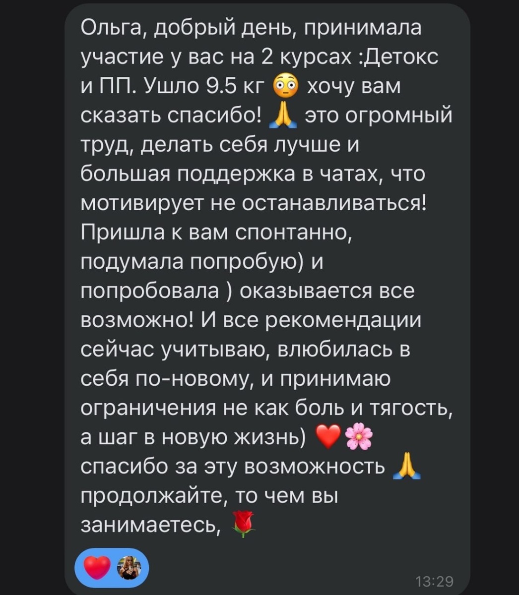 💌 Каждый раз, когда читаю вашу обратную связь, сердце радуется! ❤️ Девочки, вы только представьте: у кого-то минус 8 см в талии за месяц, кто-то сбросил 12 кг и чувствует себя лёгкой и здоровой, а кто-то спустя год похудел на 30 кг и даже стал мамой! ❤️ 🏆Для тех, кто ещё сомневается, нужно ли менять свою жизнь, – читайте,вдохновляйтесь и присоединяйтесь. 🏆 Здесь реальные истории, вдохновляющие результаты и честные эмоции ! 🏆Самые внимательные найдут в отзывах много полезного: - Как отекающее тело превращается в стройное и подтянутое; - Как уходят не только лишние килограммы, но и страхи, сомнения, неуверенность; - Как питание становится удовольствием, а не борьбой с собой. ✨ Полезный инсайт для вас: Самое важное в изменении тела – это перепрошивка привычек. 🏆Все мои ученицы отмечают: как только отпускает тяга к сладкому и перееданию, жизнь кардинально меняется. 🏆Если вы всё ещё думаете, что без силы воли не обойтись – спешу вас разубедить! 🏆Система делает за вас большую часть