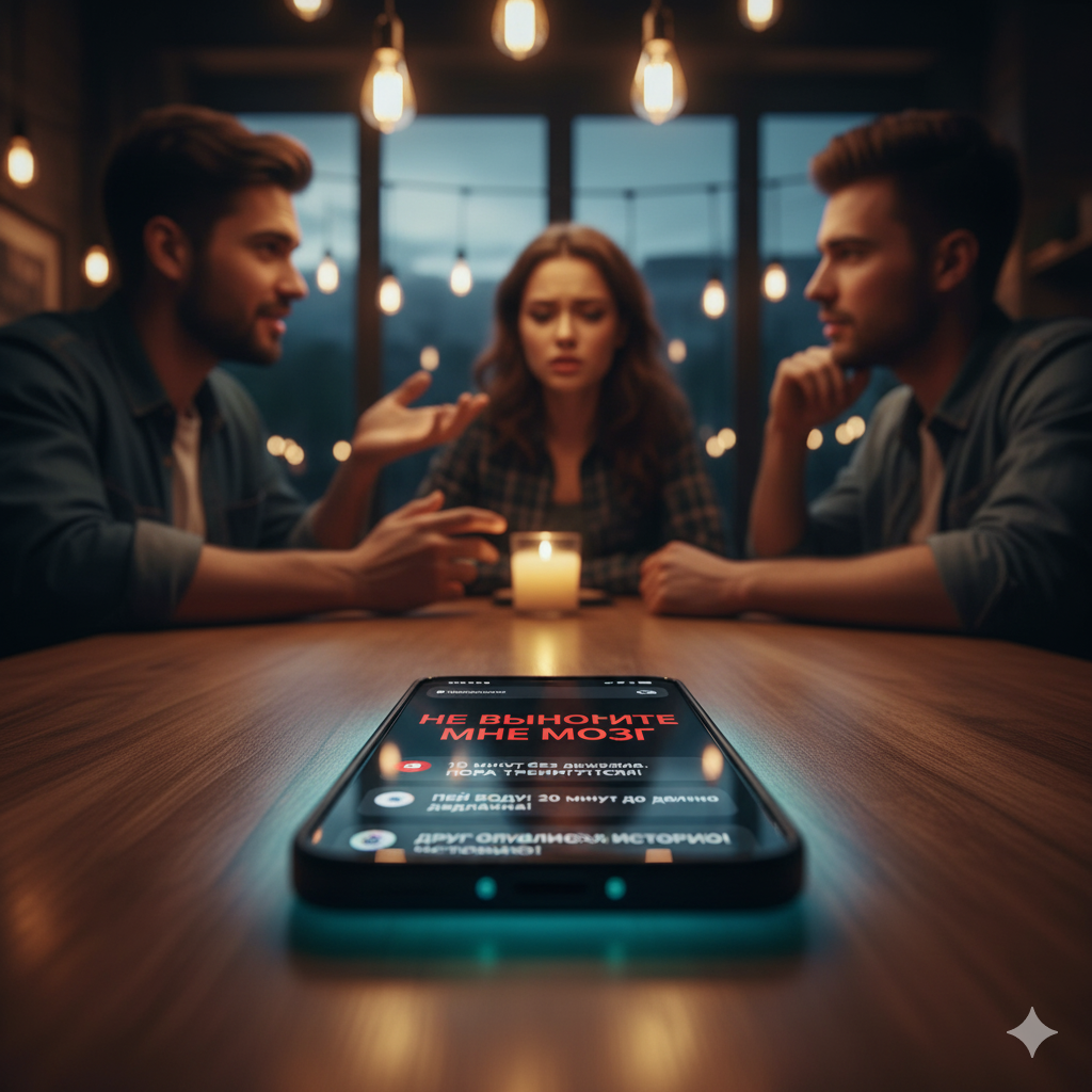 НЕ ВЫНОСИТЕ МНЕ МОЗГ Когда ваш смартфон становится вашим надсмотрщиком Представьте себе: вы сидите в ресторане с друзьями. Вы решили провести время без гаджетов, чтобы поговорить и насладиться моментом. Но ваш телефон, лежащий экраном вниз, вдруг начинает вибрировать. И не просто так, а с требовательной настойчивостью, будто хочет сказать: "Возьми меня! Там что-то срочное!" Вы игнорируете это, но вибрация не прекращается, а наоборот, становится сильнее и настойчивее. Вы смотрите на экран и видите уведомления: "Уже 10 минут вы не двигались, начните тренировку!", "Пора пить воду, у вас осталось всего 20 минут", "Ваш друг из ВКонтакте опубликовал новую историю, посмотрите её!". Вы осознаёте, что ваш телефон, созданный, чтобы помогать вам, превратился в надсмотрщика, который контролирует каждый ваш шаг, выносит вам мозг и не даёт спокойно отдохнуть. Совет: Как взять контроль над своим смартфоном и сохранить нервы Не позволяйте смартфону диктовать вам, как жить. Возьмите контроль в свои ру