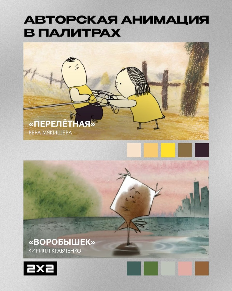 Замечали, что нередко именно цвета погружают в атмосферу мультфильма, подчёркивают эмоциональное состояние и характеры героев? Разобрали на палитры авторскую анимацию из нашего эфира. Смотрите по пятницам в 22:05 и по воскресеньям в 7:10