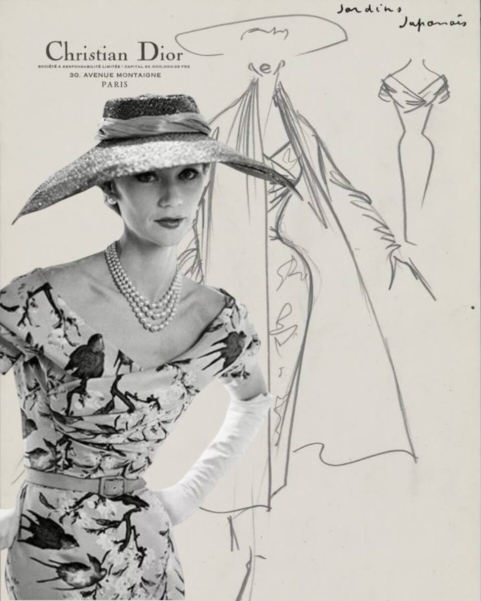 Дневное платье «Jardin Japonais» Кристиан Диор представил в летней коллекции 1953 года. Сшито оно из шелкового твила «Blue Bird», поставленного лондонской компанией Ascher. Ткань с трафаретной печатью, изображающая ветви цветущей сакуры и голубовато-серых птиц на бледном розовом фоне, была воплощением любви кутюрье к японскому искусству, зародившейся еще в детстве. Само же платье стало послом Дома Christian Dior (и, во многом, всей французской моды) во время первого после войны показа западного кутюрье в Японии в 1953.